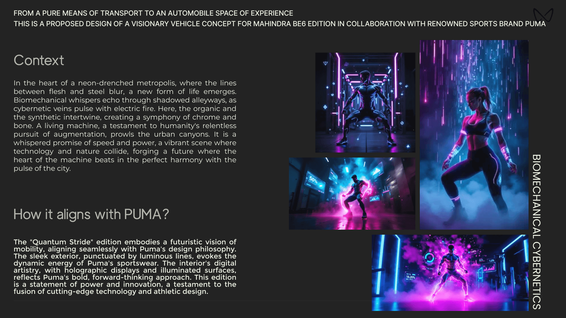 A conceptual design project envisioning a Mahindra BE.06 inspired by a Puma collaboration. This 'Quantum Stride' edition explores a cybernetic aesthetic, pushing automotive design boundaries through a fusion of athletic and futuristic elements.